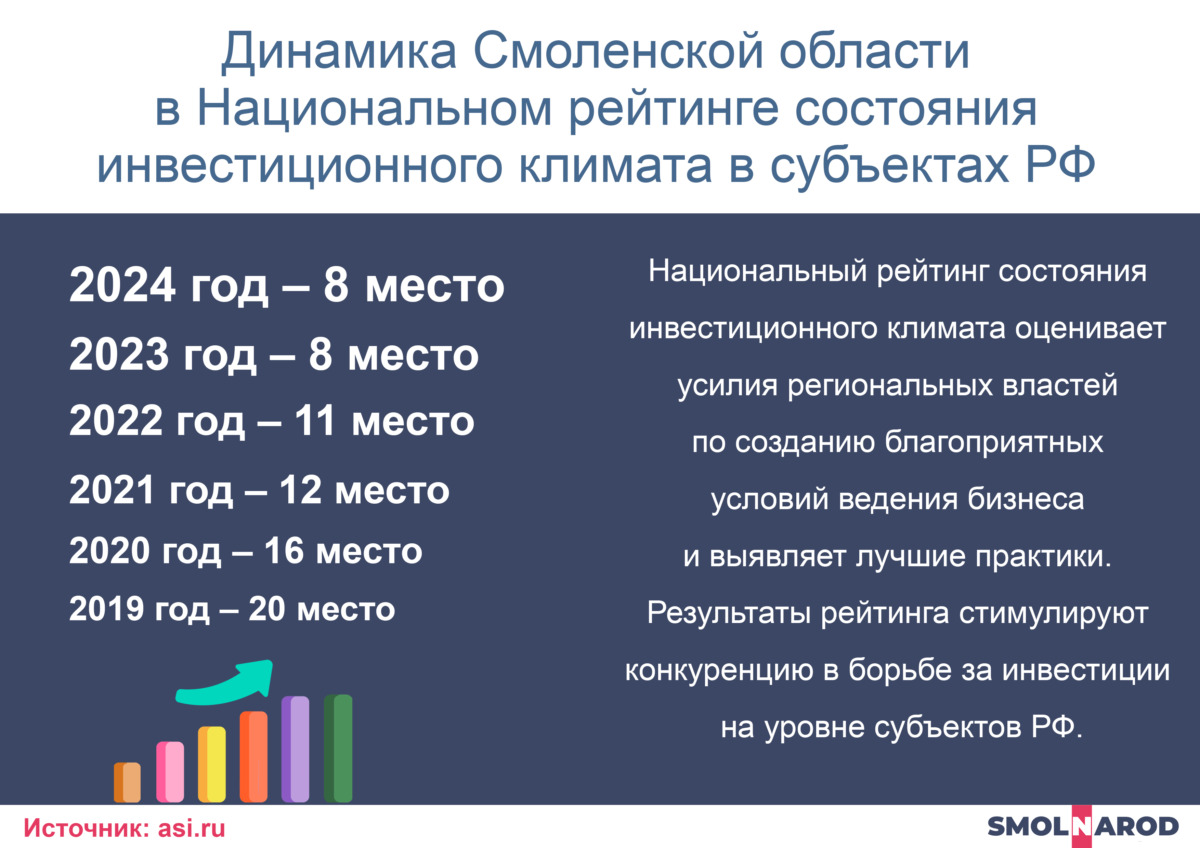 Важная составляющая роста — создание привлекательных условий для ведения бизнеса. Региональные власти планомерно внедряют федеральные методики и инструменты для повышения благоприятности деловой среды в Смоленской области. Это подтверждает не только увеличение объема инвестиций, но и позиция субъекта в Национальном рейтинге состояния инвестиционного климата, который рассчитывается по 70 показателям. Как сообщалось ранее, в прошлом году субъект занял восьмую строчку ранжира, об этом стало известно минувшим летом в ходе Петербургского международного экономического форума. Комментируя позицию региона в рейтинге, Василий Анохин заявил, что поддержка предпринимателей и формирование благоприятных условий для бизнеса — это одна из основных задач смоленского правительства.