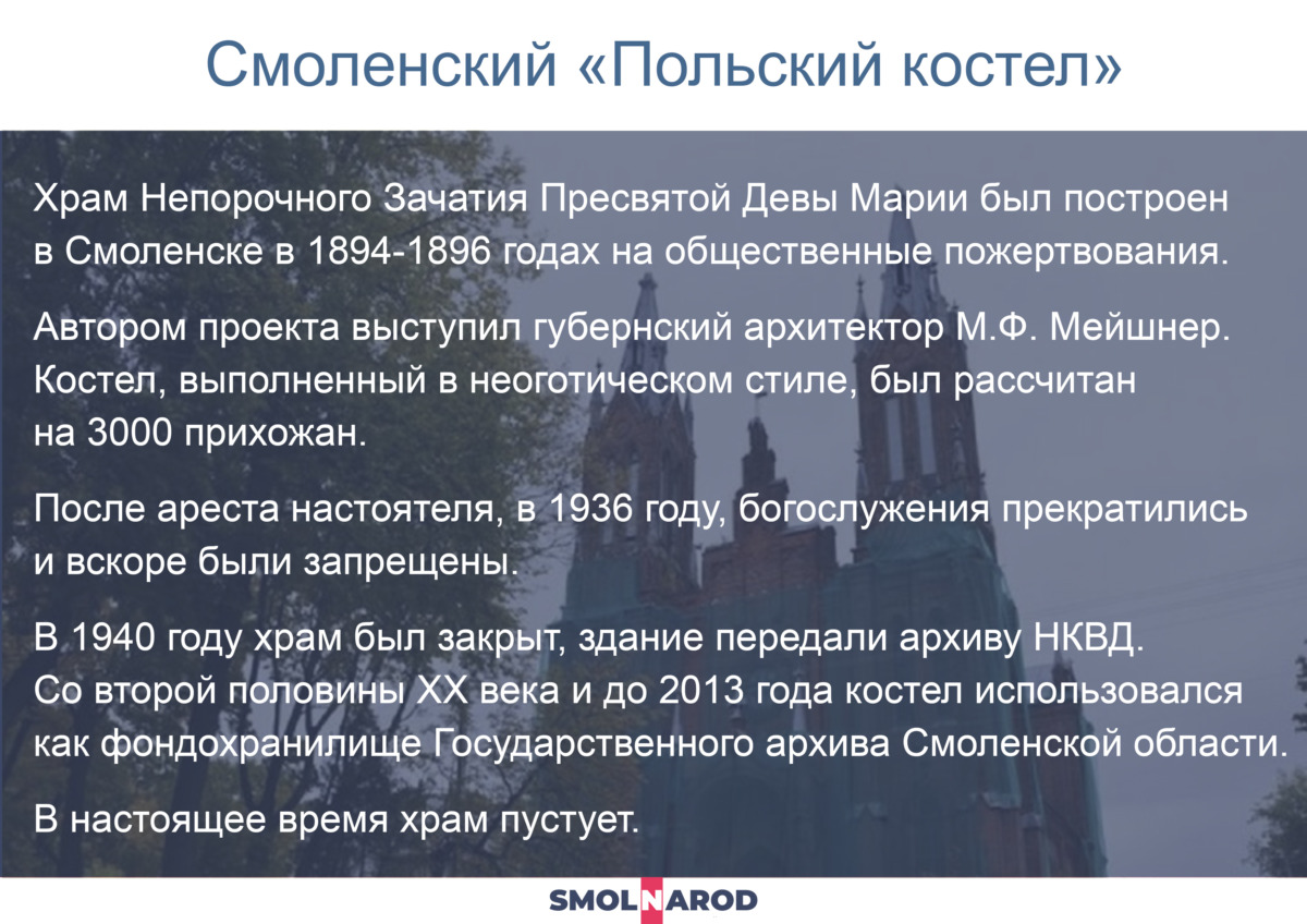 Как пояснил глава региона, цель первого этапа реставрации – остановить прогрессирующее разрушение объекта культурного наследия федерального значения. В настоящее время специалисты проводят расчистку костела и его территории от остатков мусора, который остался с 2013 года, когда из здания храма переехало фондохранилище Государственного архива Смоленской области.