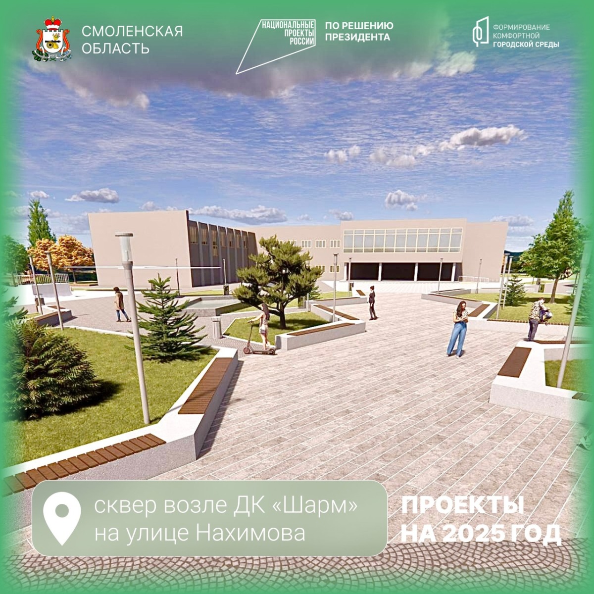 Отметим, что облагораживание публичных пространств проводится по федеральному проекту «Формирование комфортной городской среды» нацпроекта «Жильё и городская среда». В Смоленской области уже изменился облик без малого 700 общественных и дворовых территорий.