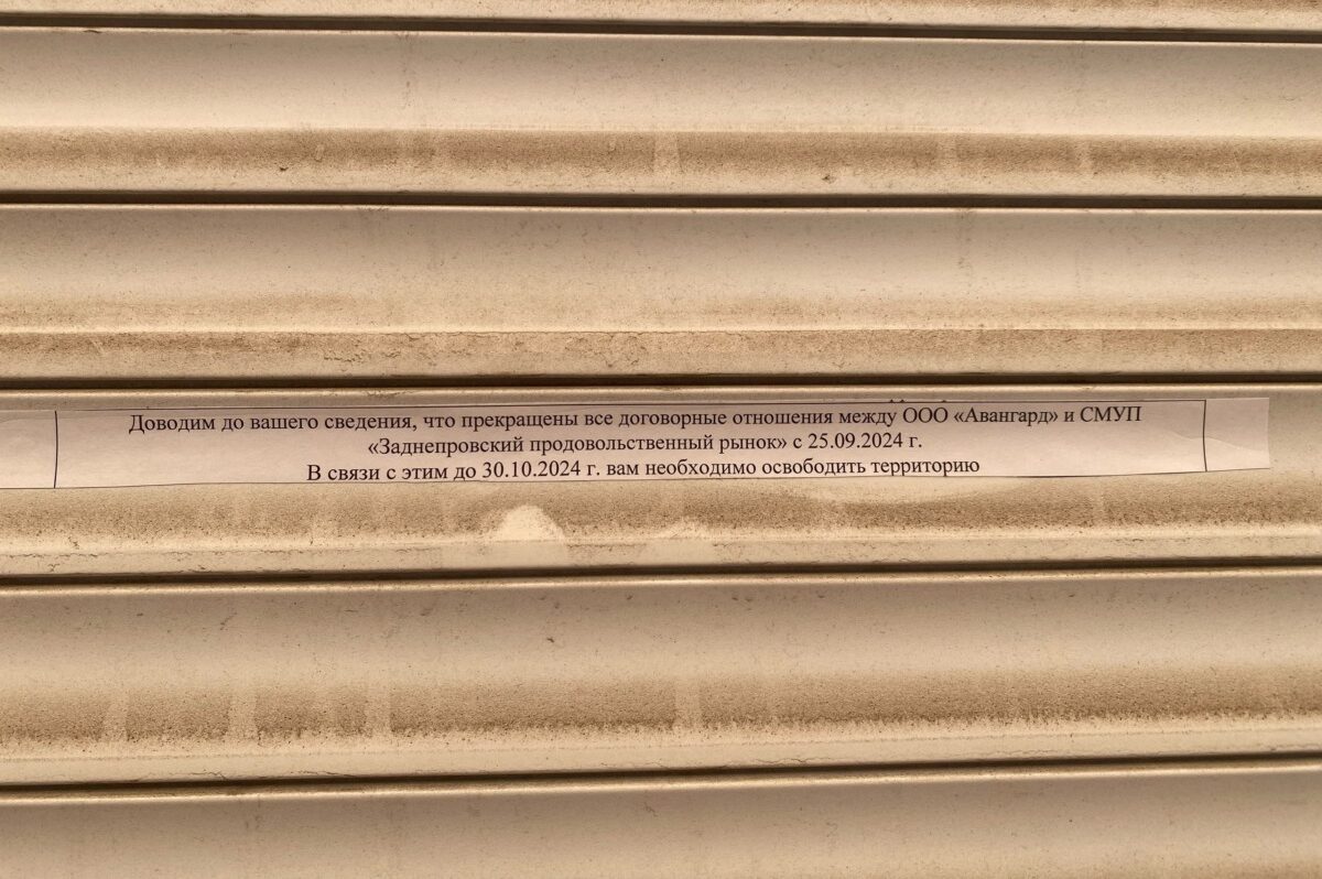 В среду же, 25 сентября, по всему рынку были развешены подобия объявлений без каких-либо подписей и печатей. Содержание этих посланий нехитрое: предпринимателям необходимо освободить торговые объекты до 30 октября.