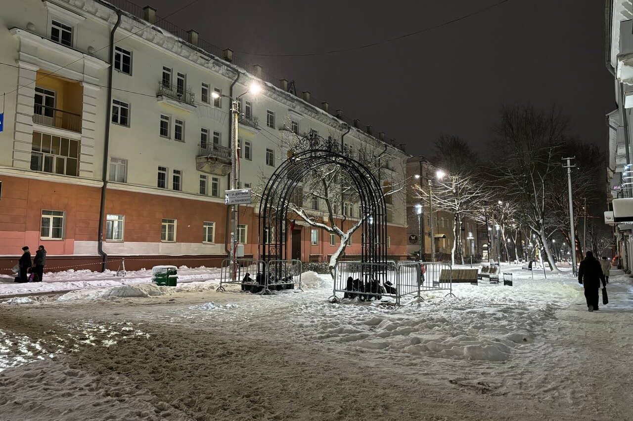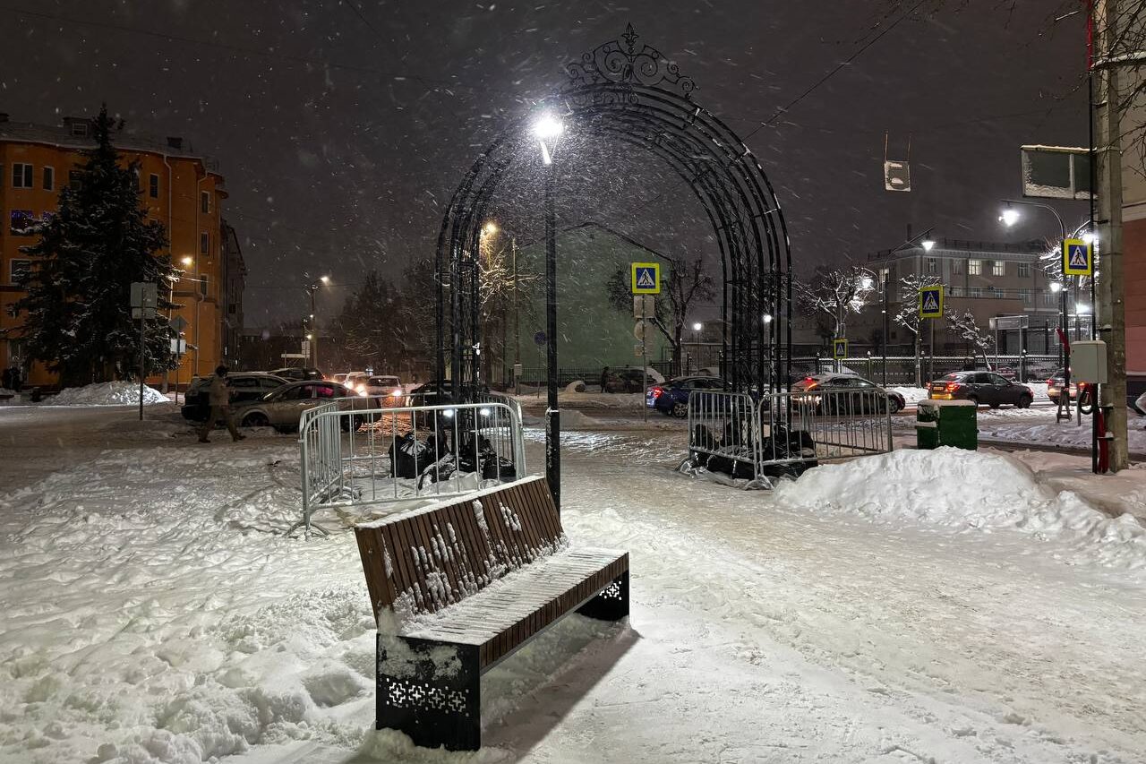 Специалисты Зеленстроя приступили к установке арки в понедельник, 29 декабря. Судя по ограждениям и мешкам-утяжелителям, оставленным по обе стороны конструкции, процесс еще не завершен.
