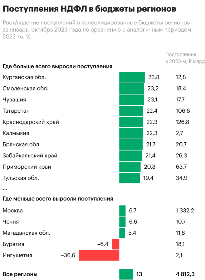 За десять месяцев 2023 года лидерами по росту поступлений НДФЛ в региональные бюджеты стали Курганская область (плюс 23,8% к январю-октябрю прошлого года), Смоленская область (23,2%), Чувашия (23,1%), Татарстан (22,4%), Краснодарский край (22,3%). Как сообщает РБК, со ссылкой на данные из ФНС, еще в четырех регионах прирост подоходного налога составил более 20% в годовом выражении – Калмыкия, Брянская область, Забайкальский край, Приморский край. У Тульской области отмечен прирост менее 20%.