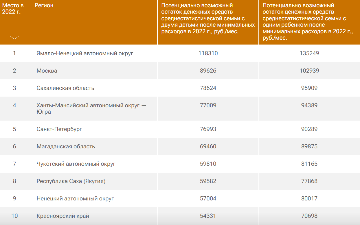 Ямало-Ненецкий автономный округ снова возглавляет рейтинг. После минимальных расходов в семье с двумя детьми остается более 118 тысяч рублей. На второй строчке — Москва, на третьей — Сахалинская область.