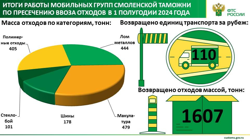 В первом полугодии 2024 года должностные лица мобильных групп Смоленской таможни остановили 110 транспортных средств, в которых находились отходы общей массой 1,6 тысячи тонн. В итоге на территорию Республики Беларусь возвращены следующие категории товаров: 479 тонн макулатуры, 444 тонны лома металлов, 405 тонн полимерных отходов, 178 тонн автомобильных шин и 101 тонна стеклобоя.