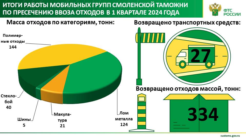 В первом квартале 2024 года сотрудники мобильных групп Смоленской таможни возвратили 27 транспортных средств, которые перевозили отходы массой более 334 тонн. Начальник отдела контроля за ввозом и оборотом товаров регионального ведомства Илья Зальмензон рассказал, что обратно в Беларусь отправили следующие категории товаров: 144 тонны полимерных отходов, 124 тонны лома металлов, 21 тонну макулатуры, 5 тонн автомобильных шин и 40 тонн стекла. По его словам, главная задача смоленских таможенников в этой сфере – соблюдение экологической безопасности нашей страны.