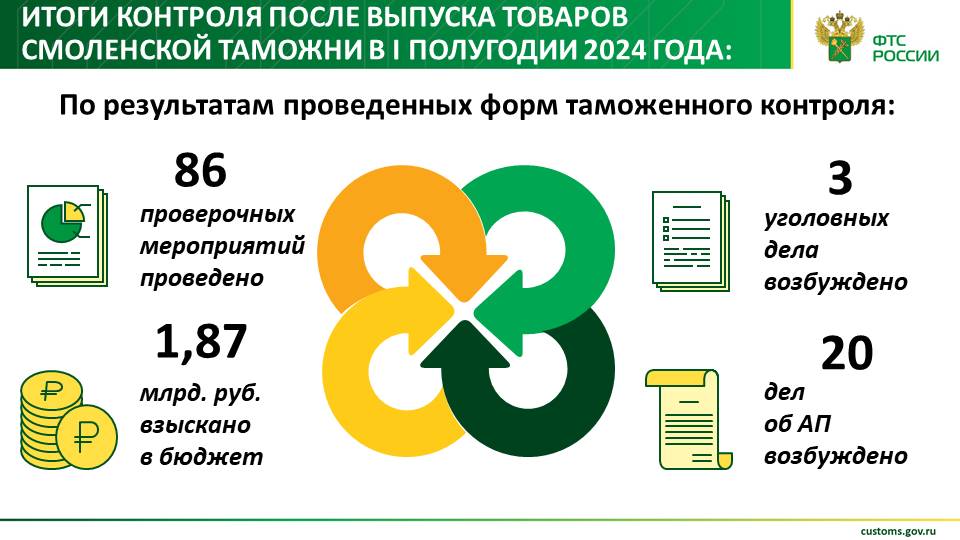В первом полугодии 2024 года подразделения контроля Смоленской таможни взыскали после выпуска товаров в казну государства 1 миллиард 877 миллионов рублей таможенных платежей, пеней и штрафов. Всего возбуждено 20 дел об административных правонарушениях и три уголовных дела.