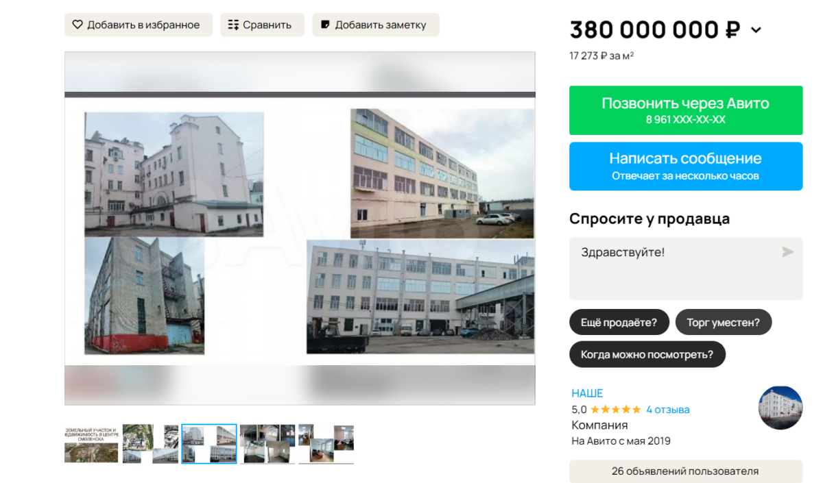 Смоленскую чулочную фабрику выставили на продажу на популярном сайте объявлений. В описании к объявлению сказано, что комплекс на улице Соболева расположен на земельном участке площадью 3,72 гектара. За 380 миллионов рублей можно приобрести административный и два производственных корпуса, а также складские помещения.