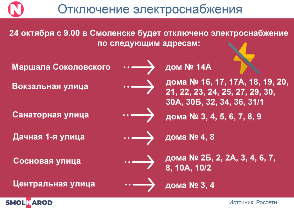 Во вторник, 24 октября, в Смоленске на нескольких десятках улиц будет отсутствовать электроснабжение. О плановых отключениях сообщили в Россетях.