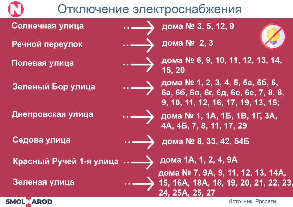 Ранее SmolNarod сообщал, что смоляне могут узнать об отключении электроэнергии через приложение «Есть свет!». Жители областного центра могут отправлять сообщения об отсутствии электроснабжения, отслеживать их статус, оформлять подписку на адреса и получать уведомления об аварийных и плановых отключениях. К слову, смоленское УФАС проверило деятельность ПАО «Россети Центр». Арбитражный апелляционный суд признал законными постановления о привлечении Общества к административной ответственности.