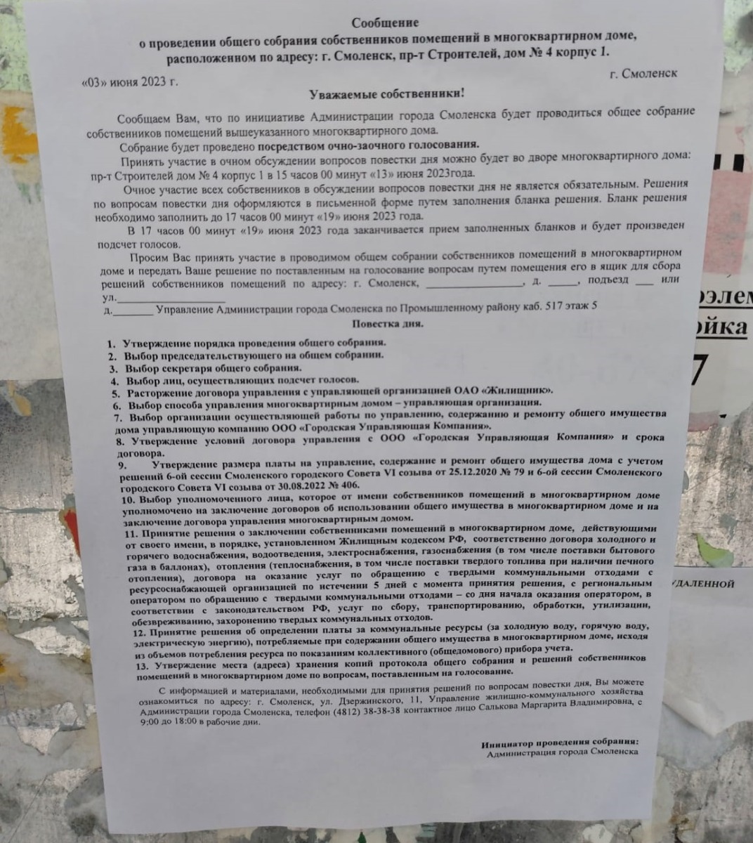 Жильцов оповещают о том, что будет проведено общее собрание собственников – «посредством очно-заочного голосования». С инициативой выступила администрация города Смоленска. Смоляне могут прийти во двор дома в назначенный день. При этом очная форма не является обязательной.