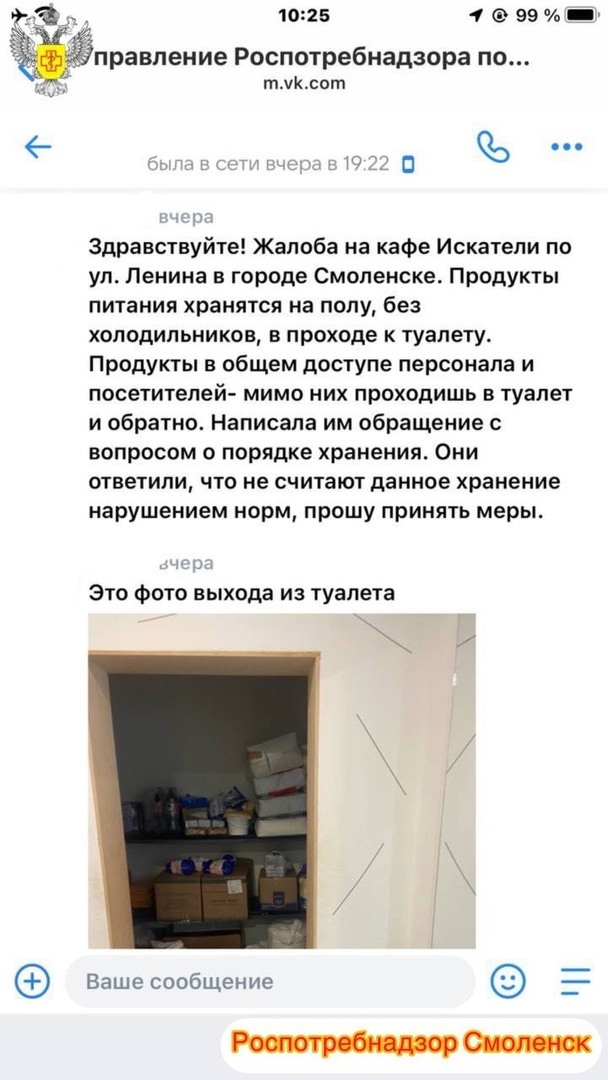 В группу «ВКонтакте» регионального управления Роспотребнадзора обратилась смолянка с жалобой на кафе «Искатели», располагающегося на улице Ленина областного центра. По ее словам, в точке общепита продукты питания хранят на полу рядом с уборной, якобы ни о каких холодильниках и речи не идет.