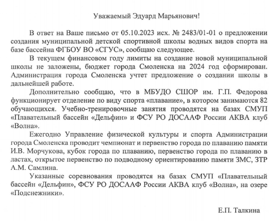 — Это единственный тренировочный объект в нашем городе, отвечающий современным требованиям. Дети готовы тренироваться, достигать результатов. В настоящее время складывается ситуация, что дети-спортсмены, в том числе зачисленные в сборную Смоленской области, занимаются платно. Ни в одну из спортивных школ они не зачислены, что соответственно не дает возможность регистрироваться на различных спортивных ресурсах, получать спортивные разряды, легитимно участвовать в соревнованиях. Тренеры должны быть со статусом тренера, а не инструктора по физической культуре, с возможностью легально представлять своих спортсменов на соревнованиях, легально судить и сопровождать. Более того, по таким видам спорта, как подводное плавание в ластах, синхронное плавание и прыжки в воду, нет ни одной спортивной школы не только в Смоленске, но и во всей Смоленской области. И раз 2024 год объявлен президентом годом спорта, просим оказать содействие в создании спортивной школы по водным видам спорта, — резюмируют смолянка.