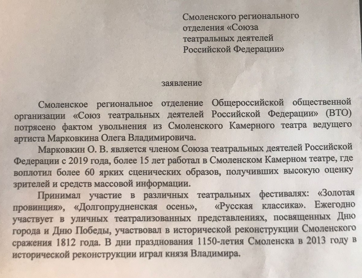 Нашему изданию Олег Марковкин подтвердил информацию о том, что трудовой договор с ним не продлили. Большая часть труппы Смоленского камерного театра высказалась за то, чтобы вернуть актера. Данное решение руководства «камерного» также поразило членов Смоленского отделения Союза театральных деятелей, которые выступили с заявлением.