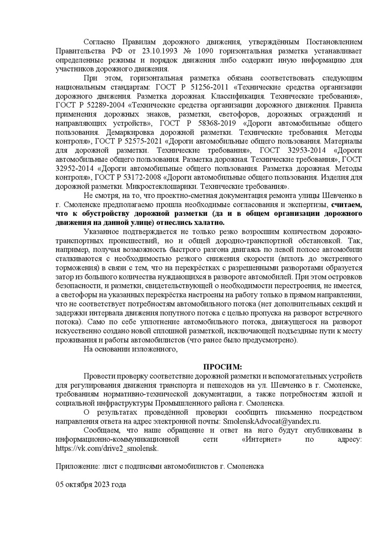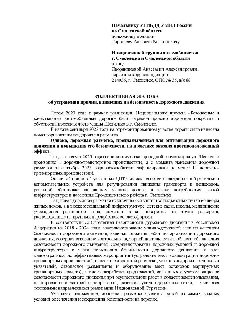 «Предлагаем всем неравнодушным оставить свои подписи под жалобой на новую разметку на улице Шевченко», — появилось сообщение в группе Drive2 Смоленск.