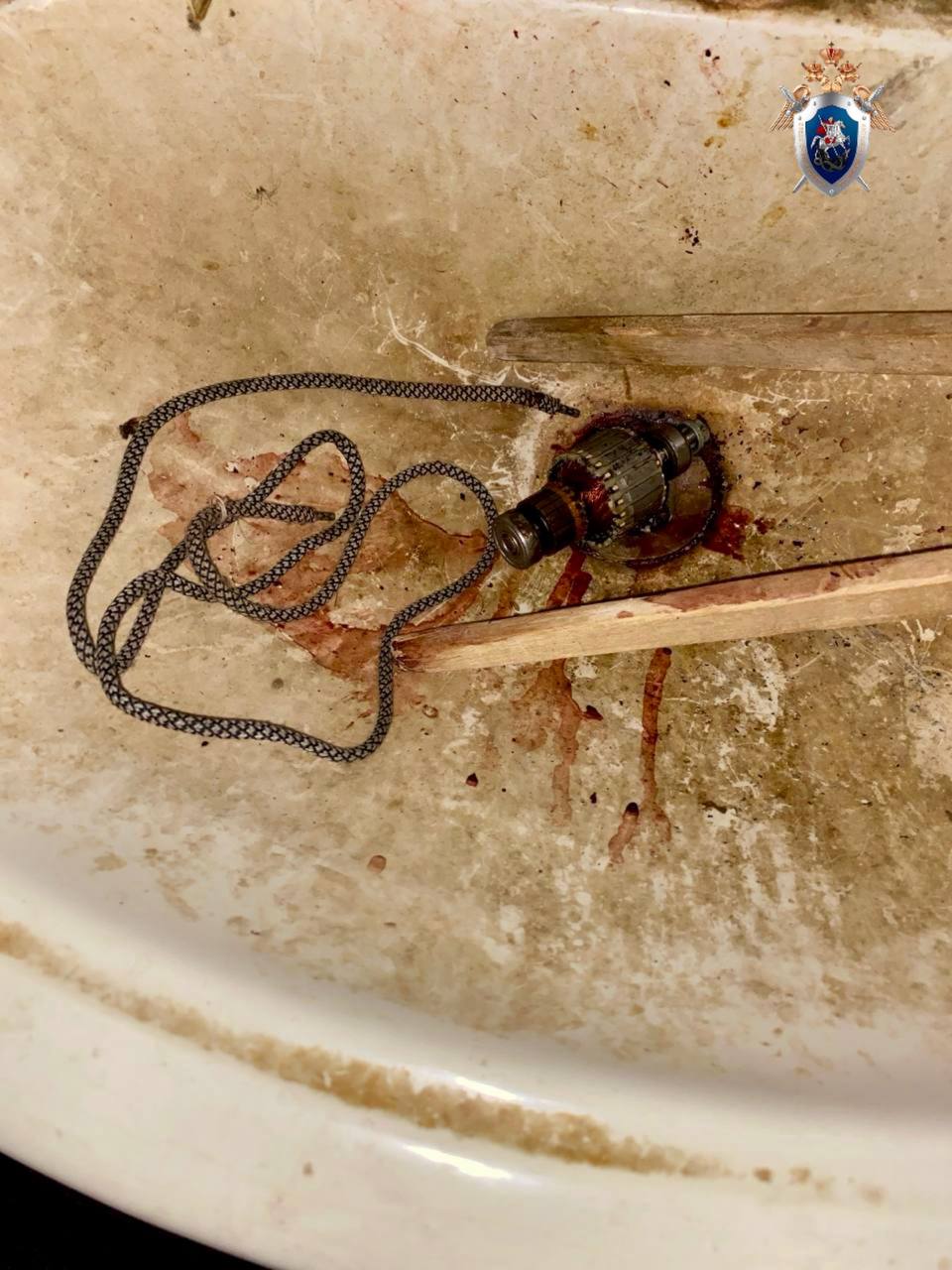 Судя по фотографиям с места преступления, преступник расчленил тело погибшего, используя ножовку.