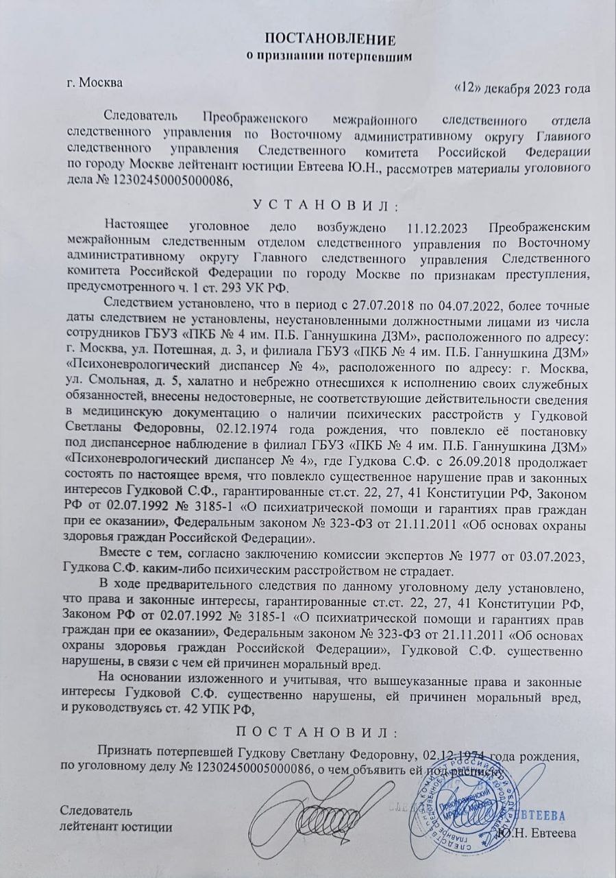 Напомним, что бывший муж смолянки Светланы Гудковой инициировал две ее принудительные госпитализации в психиатрическую больницу имени Ганнушкина в Москве. Женщине поставили страшные диагнозы. Позднее суд вынес решение об ограничении Светы в родительских правах. По мнению женщины, причиной гонений на нее стало совместно нажитое имущество. В 2022 году Светлана обратилась за помощью в редакцию SmolNarod. Все подробности читайте в материале нашего автора.