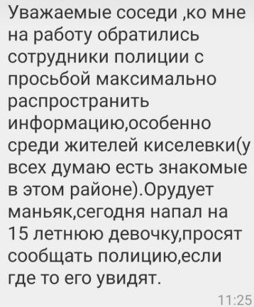 «Уважаемые соседи, ко мне на работу обратились сотрудники полиции с просьбой максимально распространить информацию, особенно среди жителей Киселевки… Орудует маньяк, сегодня напал на 15-летнюю девочку…».
