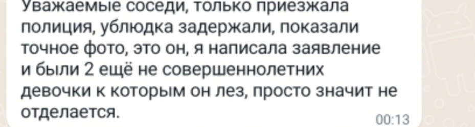 — На знакомую женщину он напал в лифте. По ее словам, «стал лезть и за что-то схватил» (конкретно не пояснила «за что» – прим. ред.). Кроме того, мужчину видели около магазина, где он заглядывался на женщин и несовершеннолетних лет десяти. Он же приставал к какой-то девочке, но его успели прогнать парни. Это всё, что я знаю.