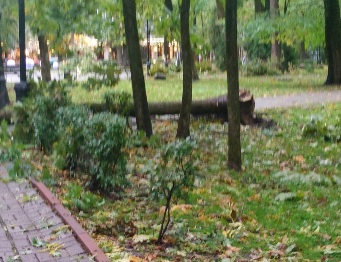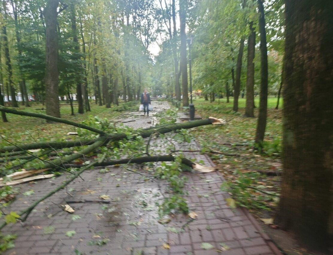 На некоторых улицах города из-за порывов ветра падали деревья, перегораживая дорогу как автомобилистам, так и пешеходам. Такая ситуация наблюдалась на улицах Ломоносова, Твардовского, Бакунина, Румянцева и в парке Блонье.