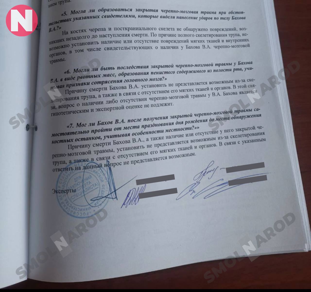 В распоряжении SmolNarod есть документ, в котором даны ответы на три важных вопроса. По словам матери Анастасии Баховой, это заключение эксперта российского центра судебно-медицинской экспертизы Министерства здравоохранения РФ: