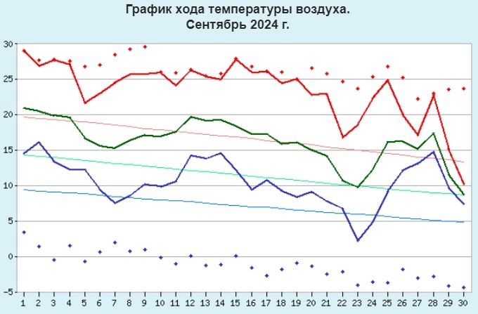 Самая высокая температура в Смоленске фиксировалась 1 сентября (+29°С), самая низкая – ночью 23 сентября (+2,2°С). За месяц 25-ть из 30 дней отмечались дневными температурами выше +20°С, из них 14 дней – превышающими +25°С.