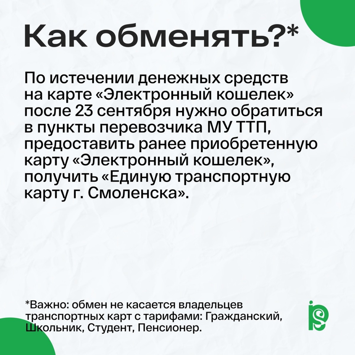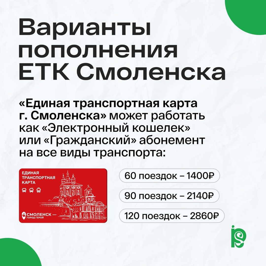 В связи с запуском нового тарифного меню и «Единой транспортной карты Смоленска» с 16 сентября приостановлено пополнение транспортных карт «Электронный кошелек». Чтобы дальше оплачивать проезд, смолянам необходимо бесплатно заменить ранее приобретенные носители на новые карты. 60 поездок стоят 1400 рублей, 90 – 2140 рублей, 120 – 2860 рублей.