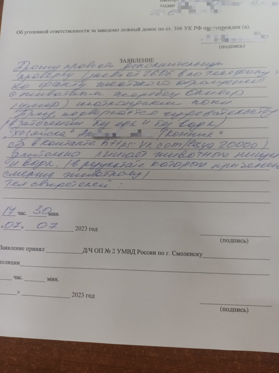 Как стало известно изданию, смоляне снова обратились в полицию. В Заднепровский РОВД сегодня, 7 июля, написано заявление с просьбой провести дополнительную проверку по факту жестокого обращения с животными.
