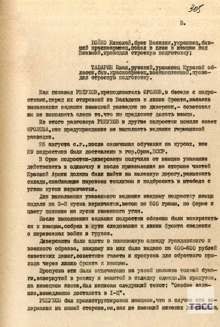 ФСБ России рассекретила архивные документы о подготовке в диверсионных школах абвера советских детей-сирот для шпионажа и диверсий в тылу Красной армии, сообщает ТАСС. Например, следствием установлено, что в ночь с 31 августа на 1 сентября 1943 года в районе города Обоянь Курской области германская разведка забросила двух подростков-парашютистов с диверсионным заданием. Ими оказались 13-летний Валентин Румянцев и 15-летний Павел Гуров. Ребята, проживая в Смоленске и находясь на воспитании в детдоме, в августе 1943 года были мобилизованы немцами и зачислены в Смоленскую школу агентов-диверсантов (село Малая Дросня в пяти километрах от города). Пройдя специальную подготовку, Румянцев и Гуров в составе школы (всего 30 человек агентов-подростков) были направлены в город Кассель (Германия), где прошли практический курс прыжков с парашютом, после чего в конце августа отправились на аэродром вблизи Орши. Уже оттуда их перебросили в тыл Красной армии.