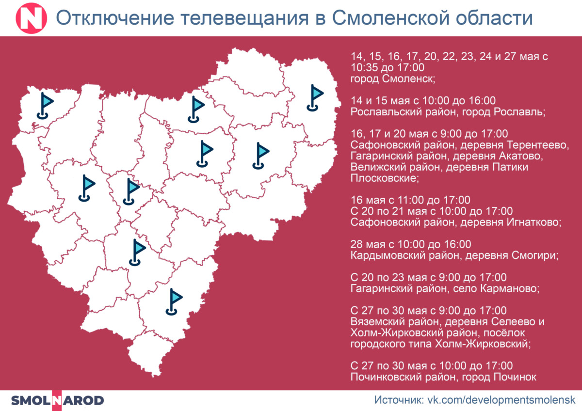География отключений достаточно широка – это Смоленск, Рославль и Рославльский район, Сафоновский, Гагаринский, Велижский, Кардымовский, Вяземский, Починковский районы и другие. Профилактические работы продлятся до конца мая. Подробнее с датами, временем и конкретными населенными пунктами можно ознакомиться в инфографике SmolNarod.