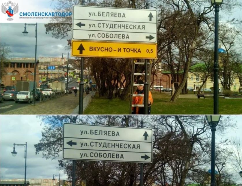 Как отметили редакции в СОГБУ «Смоленскавтодор», подобные знаки не имеют никакого отношения к организации дорожного движения и будут демонтированы. В числе организаций, которые лишились своих «желтых знаков», -заведения общепита, барбершоп, стоматологические клиники, гостиницы, торговые центры.