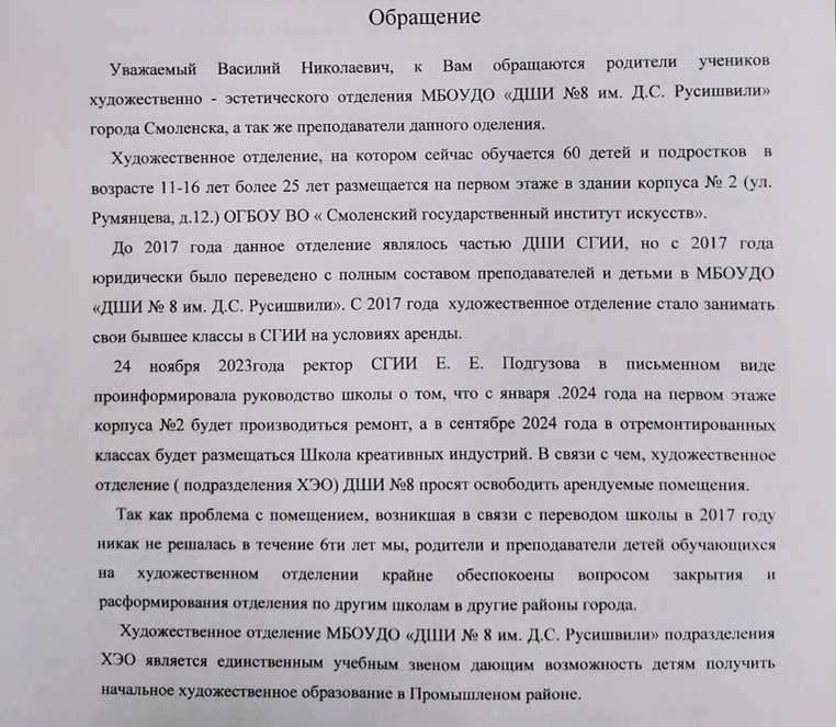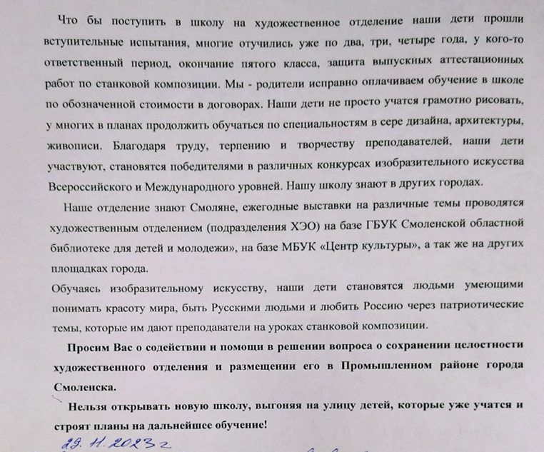 Однако, по собственной информации SmolNarod, уже есть документ за подписью ректора Смоленского государственного института искусств Еленой Подгузовой, в котором речь идет о том, что с января 2024 года занятия в школе будут невозможны. Коллектив должен в ближайшее время освободить занимаемые помещения. Корреспондент издания связался с Еленой Евгеньевной, позднее мы ознакомим наших читателей с ее комментарием.