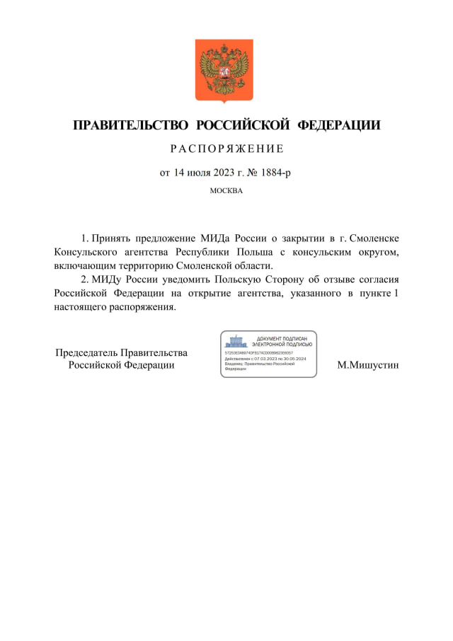 О закрытии Консульского агентства Польши в Смоленске сообщает РИА «Новости». МИД РФ должен уведомить об этом польскую сторону. Мишустин подписал соответствующее распоряжение.