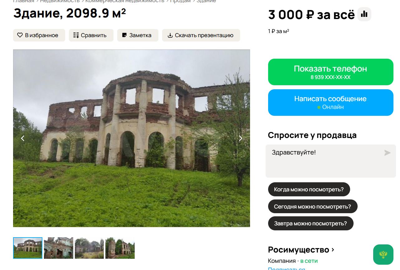 Такова начальная оценка комплекса из трёх зданий. Объявление о продаже появилось на популярном онлайн-сервисе объявлений.
