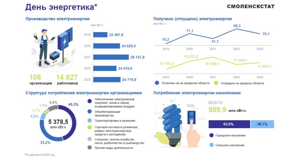 «22 декабря в 1920 году был принят государственный план электрификации России. С этого дня берет свое начало история энергетики нашей страны», — добавили в Смоленскстате.