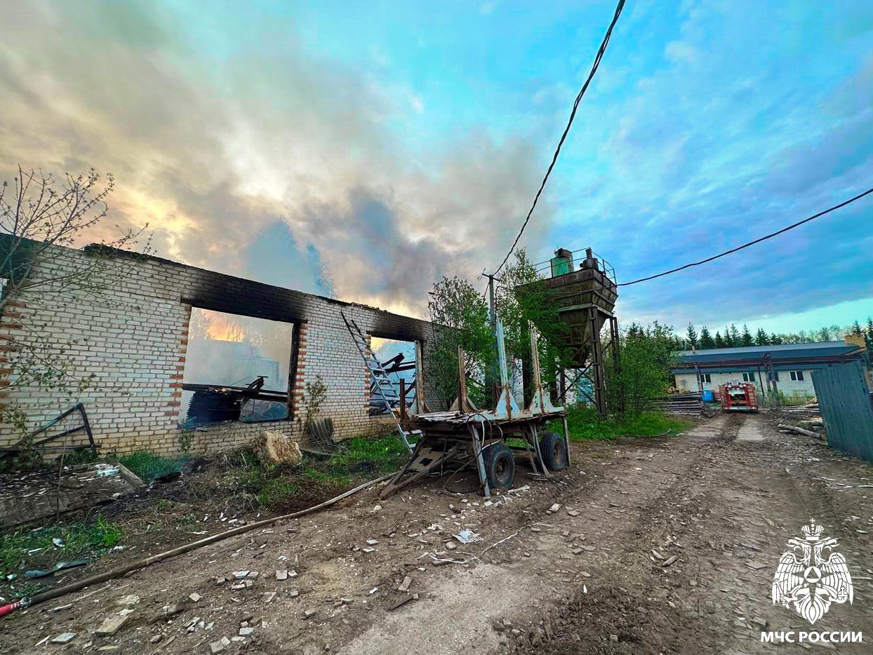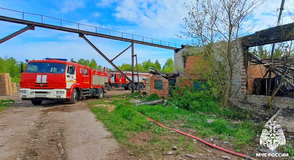 На территории пилорамы пламя охватило здание, в котором стояла тяжелая техника. В результате уничтожены три трактора и один погрузчик, кирпичное строение также выгорело по всей площади.