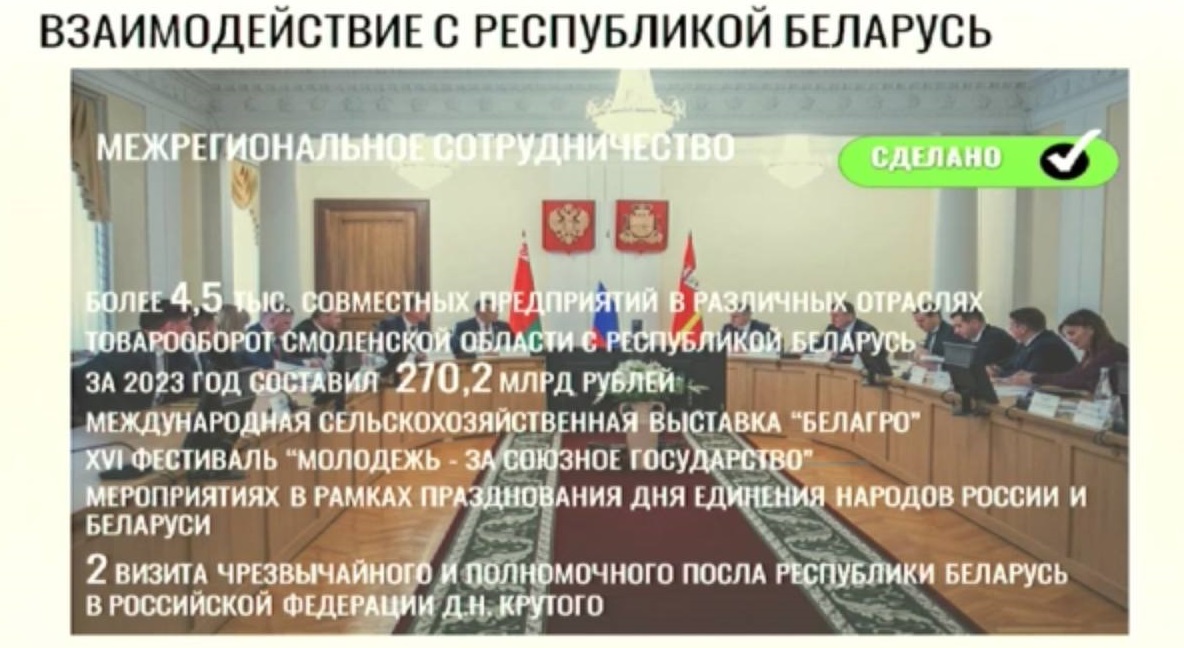 В ходе отчета о работе правительства Смоленской области в 2023 году на заседании Смоленской областной Думы Василий Анохин рассказал о развитии отношений с Республикой Беларусь. В минувшем году состоялось несколько встреч с чрезвычайным и полномочным послом РБ в РФ Дмитрием Крутым. В ходе встреч обсуждались направления сотрудничества в экономический и социальной сферах. В частности, отмечалось, что на территории Смоленской области зарегистрировано 4,5 тысячи совместных предприятий, а товарооборот по итогам прошлого года составил 270 миллиардов рублей.