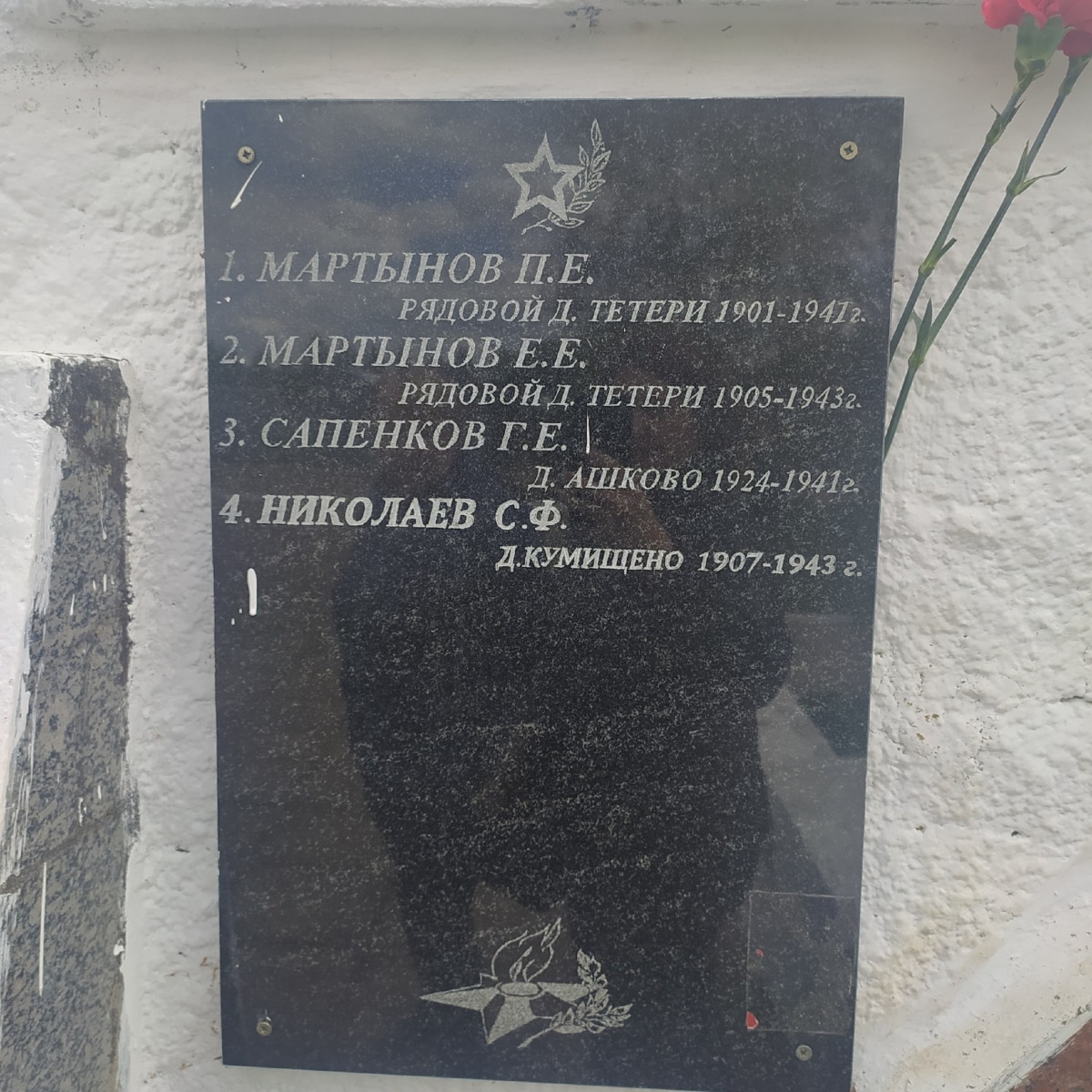 — Когда администрация Ашковского сельского поселения производила реконструкцию памятника, на новых мемориальных плитах забыли указать имена четырех человек. После обращения сделали отдельную табличку, но с ошибкой. Там есть фамилия моего прадеда — Григория Егоровича Мартынова. При этом инициалы указаны Е.Е., — рассказала нашему изданию Марина Захаренкова.