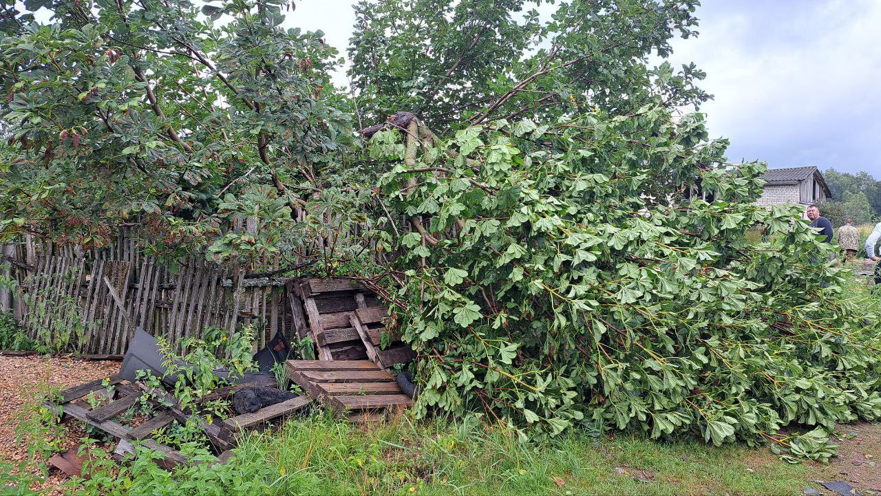 — Сам нахожусь в деревне Пнево. Ураган в большей степени захватил территорию именно четырех деревень. По словам местных жителей, действительно была воронка торнадо, так как деревья выломаны кусками. Из-за разгула стихии 15 деревьев упали, перегородили дорогу. Удалось оперативно устранить последствия непогоды. Кроме того, повреждено около ста метров проводов высоковольтной линии. Жители обеспечены временным источником энергии. По завершению ремонтных работ – переключат к постоянному. Частично повреждены дома, сараи, гаражи. Всего – порядка десяти домовладений в деревне Пнево. Людям оказывается вся необходимая помощь. Электроснабжение восстановим в ближайшее время.