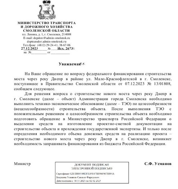 За подписью министра в адрес смолянки также поступило письмо, в котором речь идет о том, что для решения вопроса о строительстве моста через Днепр необходимо выполнить технико-экономическое обследование, а затем подготовить обращение в Министерство транспорта РФ о выделении средств на проектно-сметную документацию и прохождение госэкспертизы. И лишь тогда возникает возможность запрашивать федеральные деньги.