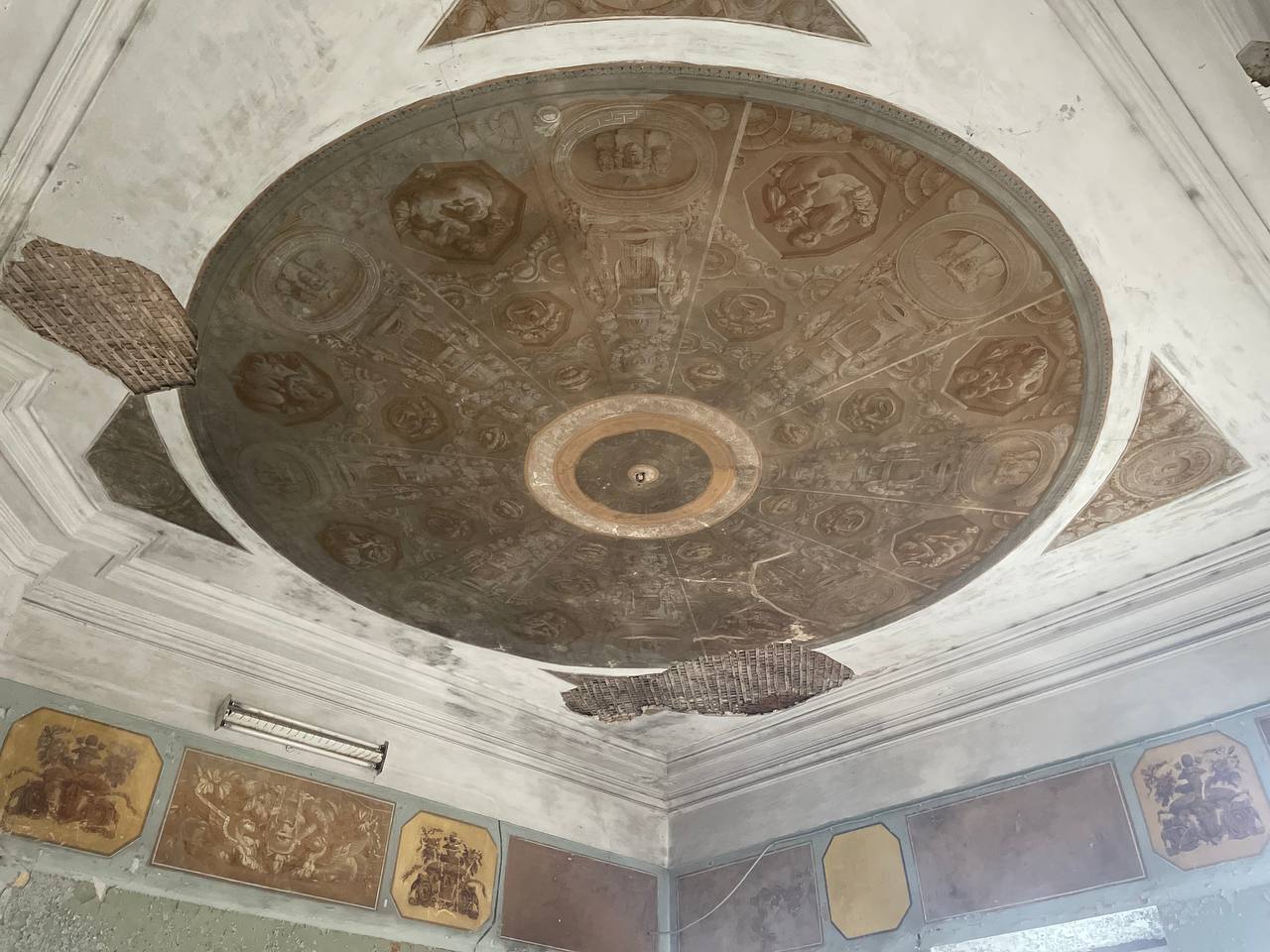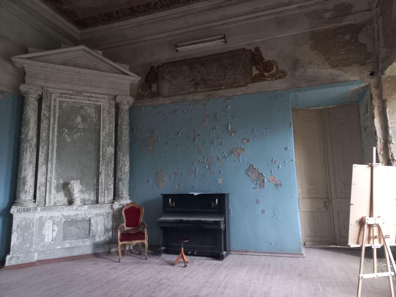 На втором этаже располагается музыкальная комната, где гости могли отдыхать в преддверии и между своих танцевальных “перфомансов”. Помещение также украшено оригинальной росписью в технике гризайль.