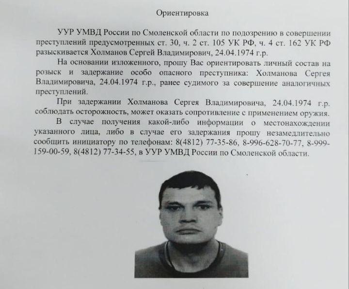Оперативники объявили план «Перехват», а в сети появилась ориентировка с фотографиями предполагаемого беглеца – 49-летнегоХолманова Сергея Владимировича. Из примет: на голове – залысина, одет в камуфлированную одежду. Ранее он был судим за совершение аналогичных преступлений.