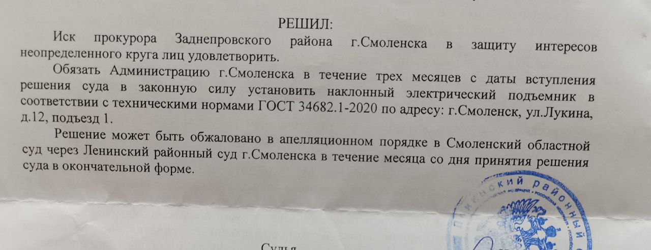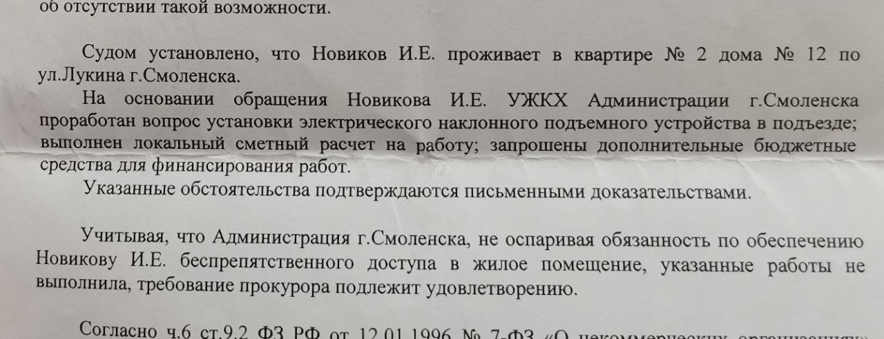 «Администрация, не оспаривая обязанность по обеспечению Новикову беспрепятственного доступа в жилое помещение, указанные работы не выполнила. Требование прокурора подлежит исполнению. Суд решил: обязать администрацию города Смоленска в течение трех месяцев с даты вступления суда в законную силу установить наклонный электрический подъемник», — говорится в решении суда.