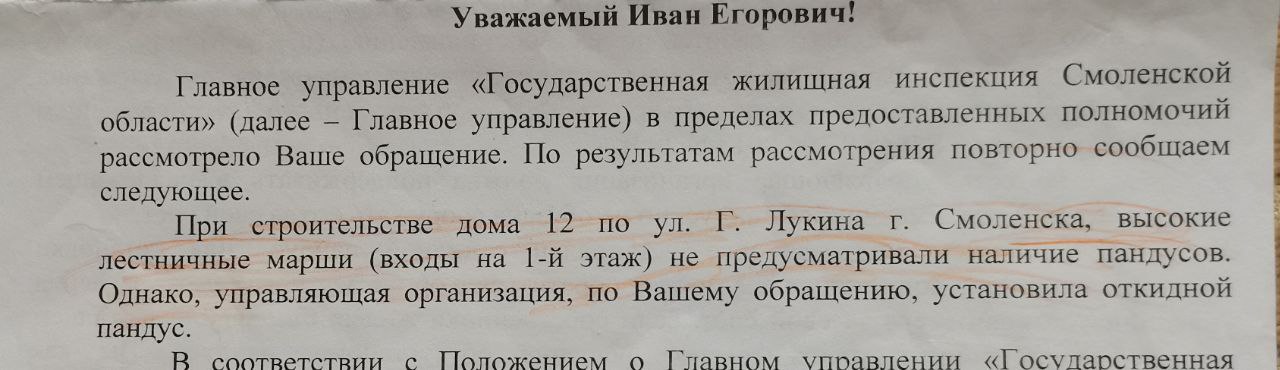 Прошли три месяца, за ними еще три, наступило лето 2023 года, однако подъемник так и не был установлен. В июне дело приняло новый оборот: Иван Егорович получил письмо от управления ЖКХ администрации города, в котором говорится следующее: