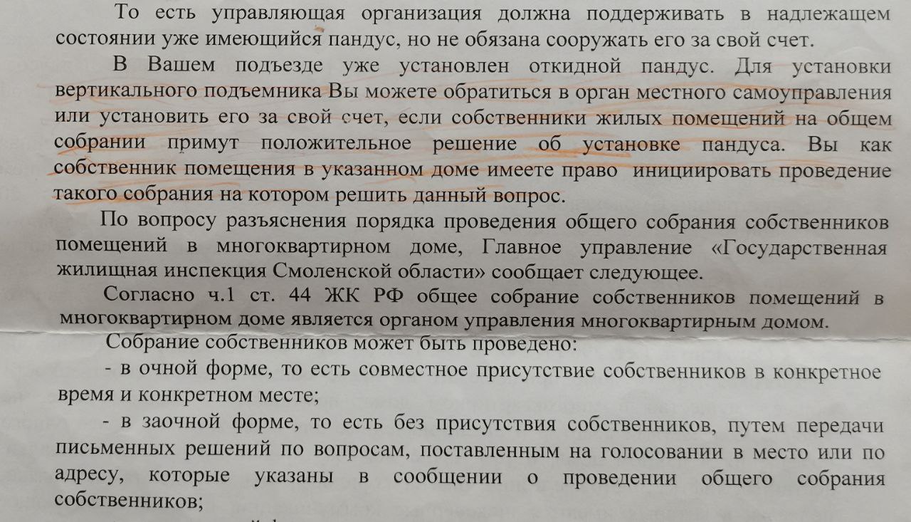 «Для установки вертикального подъемника вы можете обратиться в орган местного самоуправления или установить его за свой счет, если собственники жилых помещений на общем собрании примут положительное решение о его установке. Вы как собственник имеете право инициировать такое собрание», — говорится в письме Госжилинспекци.