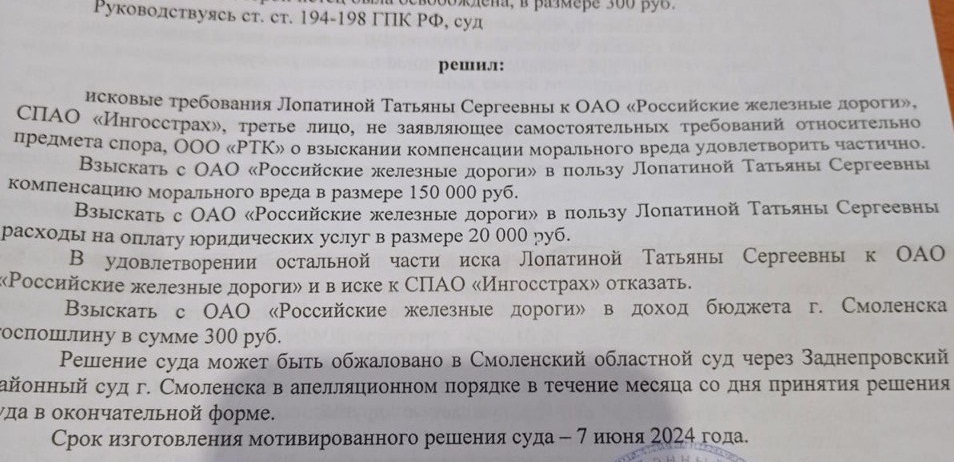 В итоге суд взыскал в пользу Татьяны компенсацию в размере 150 000 рублей и 20 тысяч рублей – расходы на оплату юридических услуг. Смолянка также сообщила нашей редакции, что представители РЖД подали апелляцию, дата заседания пока еще не назначена.
