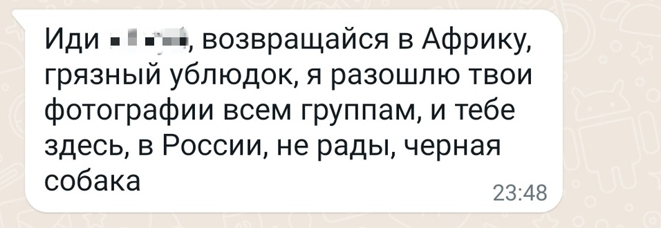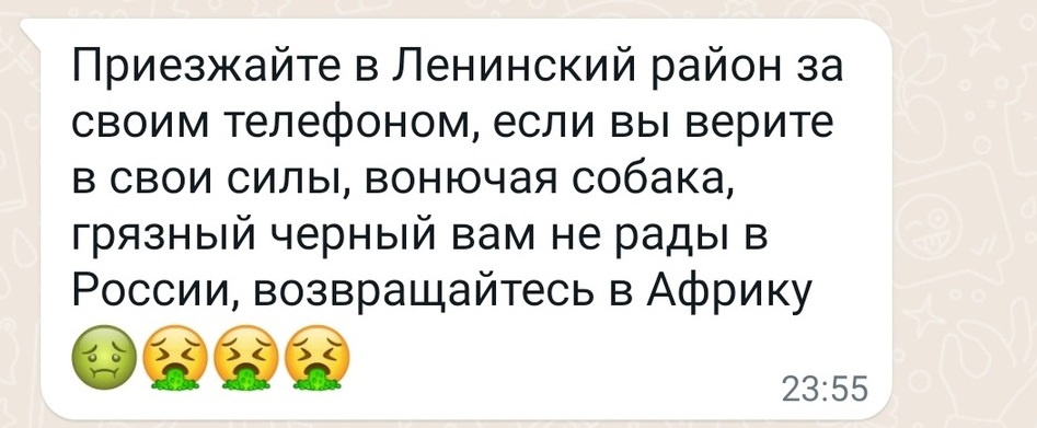 «Копам наплевать на таких африканских обезьян… Иди на***… Возвращайся в Африку! Будьте осторожны, я знаю, где вы ходите по магазинам, падальщики».