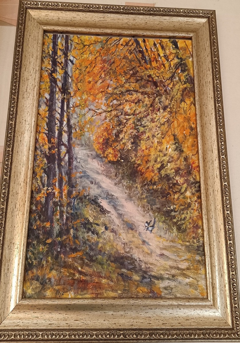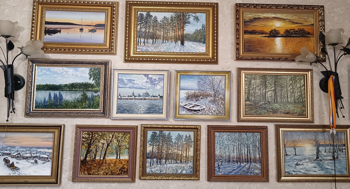Кухня, зал, прихожая – везде в квартире картины мастера. В основном, это пейзажи. Художник рисует свои любимые места, например, Шмаково в Смоленской области, Пржевальское…Он также рисует портреты … Работы создает чаще всего по памяти, реже – по фотографиям. Мастер предпочитает работать в технике масло.